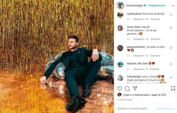 Сергей вальяжно развалился, оперевшись на блестящие диско-шары. Золотой фон придал картинке еще более гламурный вид. С идеальной прической, одетый с иголочки, Лазарев дерзко расставил ноги и раскинул руки, посмотрев куда-то в сторону. "Король танца