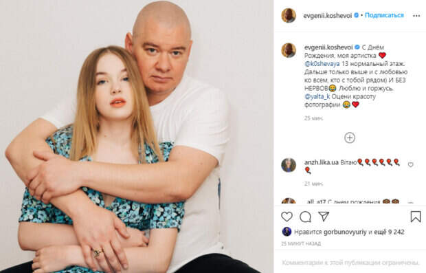 В кадре Евгений, в белой футболке, обнимает дочь-красотку за плечи, сидя сзади нее. Варвара, в платье в голубой цветочек, прильнула к отцу, коснувшись головой его щеки. "С Днём Рождения, моя артистка ❤️ @k0shevaya 13 нормальный этаж. Дальше только выше и с любовью ко всем, кто с тобой рядом) И без нервов