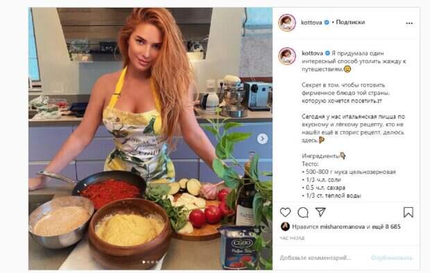 Об этом пишет Politeka.net со ссылкой на страничку знаменитости. "Я придумала один интересный способ утолить жажду к путешествиям. Секрет в том, чтобы готовить фирменное блюдо той страны, которую хочется посетить. Сегодня у нас итальянская пицца по вкусному и лёгкому рецепту, кто не нашёл ещё в сторис рецепт, делюсь здесь", - написала звезда под фото. "Нет слов , обожаю пиццу !!! Надо срочно приготовить по вашему рецепту", "Отличная идея не носить нижнее белье на кухне", "Уже так аппетитно!". Сообщалось, что известная певица и блогерша Татьяна Котова сверкнула безупречной фигурой на новом фото. Перед камерой Таня появилась в синем халатике, который набросила на обнаженное тело, но это ее совсем не смущает, она весело позировала фотографу, прикрыв пышную грудь и выставив напоказ свои стройные ножки. Напомним, экс-ВИА Гра Татьяна Котова сбросила трусики и обратилась к сильному полу Также Politeka сообщала, что экс-ВИА Гра Котова в платье из "золота" заставила учащенно биться сердце А еще Politeka писала, что соблазнительная экс-ВИА Гра Котова приспустила белье, зажав пышные прелести рукой