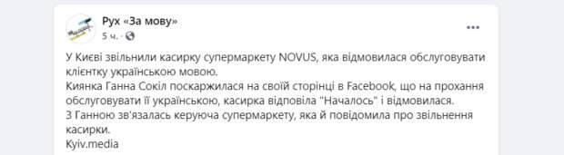 Женщина потребовала руководство разобраться и принять меры по отношению сотрудницы Семчук Оксаны. После этого Анна Сокол получила ответ от управляющей данного магазина сети. В нем сообщалось, что руководство торговой точки приняло решение уволить с должности кассира Семчук Оксану. С остальным персоналом провели образовательную беседу. Также компания принесла свои извинения Анне за поведение их кассира и попросила прощения. Большинство пользователей сети радуются такому развитию событий. Также ранее сообщалось, что с 16 января 2021, все поставщики услуг обязаны обслуживать потребителей и предоставлять информацию о товарах и услугах на украинском языке. За нарушение закона предусмотрены штрафы от 300 до 400 необлагаемых минимумов доходов граждан. Такая сумма не будет взиматься с персонала, который непосредственно будет нарушать языковой закон, а будет взиматься с предприятия. Напомним о новых штрафах, которые ударят по кошелькам украинцев, закон уже приняли в Раде. Как сообщала Politeka, выплаты повысят, в Раде порадовали украинцев и раскрыли, откуда возьмут деньги. Также Politeka писала, что украинцы смогут выйти на пенсию досрочно, кому полагаются льготные выплаты.