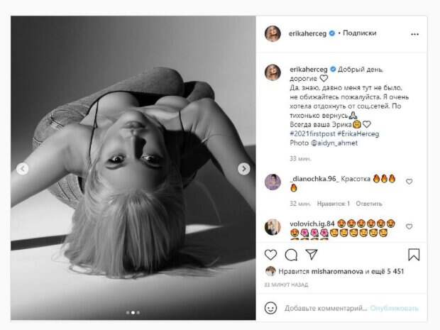 На других кадрах девушка показала еще несколько провокационных поз. Об этом пишет Politeka.net со ссылкой на страничку знаменитости. "Добрый день, дорогие Да, знаю, давно меня тут не было, не обижайтесь пожалуйста. Я очень хотела отдохнуть от соц.сетей. По тихонько вернусь Всегда ваша Эрика", - написала звезда под фото. Фанаты поставили более 5 тысяч лайков и написали комментарии: "Красотка", "с возвращением, дорогая, мы скучали", "Нехватка вас", "Ждем твою новую песню", "Сочная какая! обожаю тебя!", "Эрика дорогая, красавица наша", "Безумная красотка", "Кичи, ура, очень скучаем". Мы писали, что экс-солистка "ВИА Гры" Эрика Герцег вызвала бурю эмоций свежим фото. Блондинка позировала в красном пальто, которое, по-видимому, надела на обнаженное тело, так как она его немного распахнула, засветив бледную кожу. Эрика легла на спину, томно задрала подбородок и закрыла глаза, будто от удовольствия. При этом открыла рот, коснувшись алыми губами массивного украшения в виде цепи. Напомним, "любовница" Меладзе Эрика Герцег раскрыла пиджак, завлекая на шалости А еще Politeka писала, что "любовница" Меладзе Эрика Герцег во всем белом потрясла худобой Также Politeka сообщала, что "любовница" Меладзе Эрика Герцег без макияжа и прически довела до слез