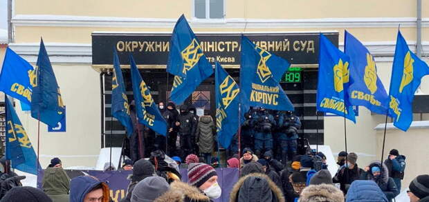 Украинские праворадкиалы провели акцию протеста под Окружным административным судом Киева, который ранее отменил переименование ряда киевских улиц. Об этом, передает корреспондент «ПолитНавигатора», сообщает телеграм-канал «Политика страны».