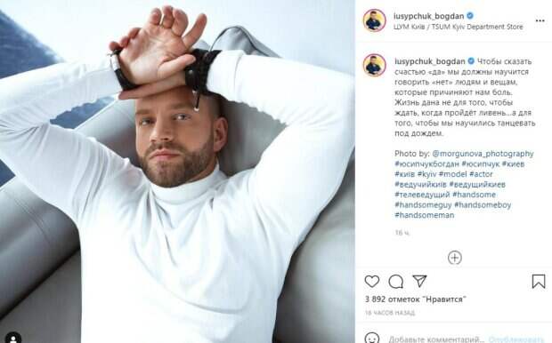 Телеведущий и дальше продолжает вести активную деятельность в соцсетях, и на этот раз поделился философскими мыслями о счастье. "Чтобы сказать счастью «да» мы должны научится говорить «нет» людям и вещам, которые причиняют нам боль. Жизнь дана не для того, чтобы ждать, когда пройдёт ливень…а для того, чтобы мы научились танцевать под дождем", - написал Юсипчук. Подписчики Юсипчука оценили не только глубину мысли телеведущего, но и его внешность. "Прекрасное фото. Пост с глубоким смыслом, согласна с каждым словом", "Очень крутое фото", "Как здорово сказано", "Хорошее фото и слова правильные. Ты как завжди