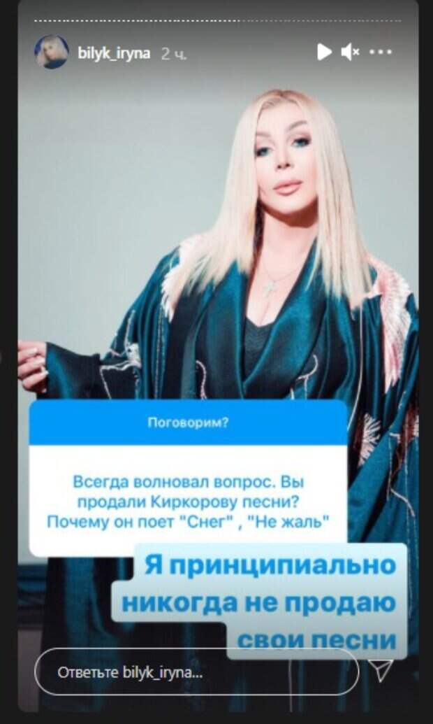 Один из них поинтересовался: "Всегда волновал вопрос. Вы продали Киркорову песни? Почему он поет "Снег", "Не жаль"?". "Я принципиально никогда не продаю свои песни", - резко ответила Билык. Ранее в интервью "МК" Ирина уже говорила о том, что не предлагала Киркорову ни сотрудничества, ни денег. Судя по всему, у нее просто щедрая душа и она готова делиться творчеством безвозмездно. "Я Филиппу не предлагала ни сотрудничества, ни денег. Я очень рада, что люди, которые на вершине, могут еще быть просто людьми... У меня же не одна песня, у меня их больше ста. Мне нравится, что ее в СНГ любят в исполнении Филиппа, и мне достаточно того, чтобы все знали, что я ее написала", - признавалась Билык. Также певица говорила, что ей понравилось исполнение "Снега" Киркоровым. Напомним, что Ирина Билык показала подросшего сына от мужа, с которым разводится: "Какая роскошь". Как сообщала Politeka, Билык рассказала про свою первую работу до популярности: "Боже, Ира...". Также Politeka писала, что Билык в свободном "балахоне" дала жару, впечатлив фанатов: "Наша Примадонна".
