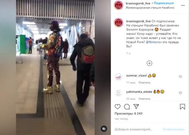 При этом на лице у самого "артиста" красовалась черная маска с "камушками". Двойник Киркорова любезно предоставил средство индивидуальной защиты очевидцу, снявшему его на камеру. "На станции Нахабино был замечен Филипп Киркоров