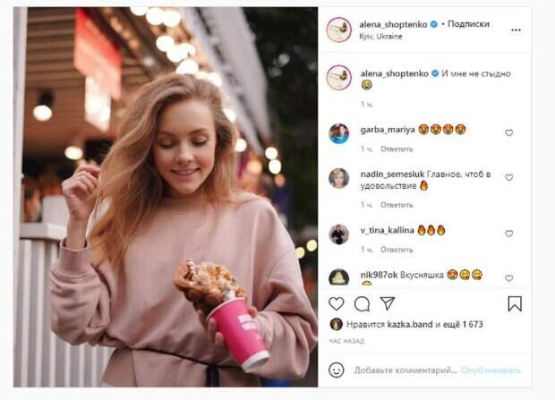 Не забывает Алена и об Инстаграм, где ведет активно страничку.  На новом фото девушка гуляла на улице. Шоптенко в руках держала стаканчик со сладостями. Алена улыбалась, смотря на свою покупку.  "И мне не стыдно", - написала Шоптенко под фотографией. Фанаты поставили более тысячи лайков, включая Александру Зарицкую из KAZKA, написав комментарии: "Главное, чтоб в удовольствие", "Вкусняшка", "Ооооо, мне сегодня тоже не было стыдно из-за заварного пирожного", "Какая же ВЫ невероятно милая и красивая", "Боже. Где такие вафли в Киеве?". Напомним, Шоптенко показала, как выматывает ее новая должность, красноречивые кадры А еще Politeka сообщала, что Джамала после "Танців з зірками" собирается жить рядом с Шоптенко и Дорофеевой, что известно Также Politeka сообщала, что Шоптенко жестко раскритиковали после первого эфира «Танців з зірками»