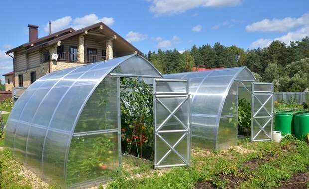 Промышленные теплицы оснащаются разнообразными устройствами для освещения, полива, дополнительными вентотверстиями. Каркас теплицы строят из деревянных планок или из металла, а «обшивают» его в современных условиях чаще всего поликарбонатом. Иногда используют стекло, но это для частных хозяйств вариант не самый удобный: это и дороже, и тяжелее, и менее удобно. Еще один вариант, который использовали до появления поликарбоната, — полиэтиленовые пленки. Все теплицы работают одинаково: собирают солнечное излучение и передают его в виде тепла, которое нагревает внутреннее пространство. От тепличного воздуха нагревается грунт. Ночью он отдает это тепло назад воздуху. Таким образом, в теплице всегда теплее, чем на улице, даже если она неотапливаемая (а большая часть теплиц на обычных участках, где не занимаются промышленным производством овощей, не отапливается). В нашем климате высаживать растения в теплицу можно уже в апреле — и наши огородники уже на майские праздники могут со спокойной душой посыпать шашлыки свежей зеленью. Но даже если на улице уже тепло, теплица сможет защитить овощи и сеянцы от ветра, сильного дождя или града и от насекомых. Фото agrarii.com Где на участке поставить теплицу Итак, вы завидуете соседу, который собирает помидоры в конце июня, и тоже решили обзавестись теплицей. Для начала, прежде чем ее заказывать, выберите для нее место на участке. И это не такая простая задача, как кажется. Согласно приведенному выше СП, «конструкции теплиц должны обеспечивать максимальное проникновение в них прямого и рассеянного света, равномерную без резких колебаний температуру, минимальные теплопотери, естественный воздухообмен для регулирования температурно-влажностного режима и возможность максимальной механизации производственных процессов». И теплицы, и парники надо ставить там, где есть уклон, чтобы в них не скапливалась дождевая вода. Дело в том, что влага из теплицы испаряется не так быстро, как хотелось. Обращать внимание надо и на инсоляцию. Ведь принцип ее работы весь построен на аккумулировании солнечного света, так что место должно быть максимально открытое. Смотрите, чтобы на теплицу как можно меньше попадала тень — рядом не должно быть сараев, бань, больших деревьев. И вот тут мы сталкиваемся с классическими «волком, козой и капустой». Ведь место для расположения теплицы должно быть не только открытым солнцу, но и прикрытым от ветра. Как обойти этот казус — мы расскажем чуть ниже. Обязательно учитывайте уровень грунтовых вод. От него до уровня грунта в вашей теплице должно быть минимум полтора метра. Иначе выращивать вы в ней сможете разве что рис. Или аир. Фото stroymanual.com Особенности ландшафта Начинающие огородники часто ставят теплицу в дальнем углу участка — там она не мешает ни проходу в баню, ни шашлычной беседке. И это фатальная ошибка. Мало того что там она может быть в тени, так еще и бегать к ней, чтобы поливать или, к примеру, подвести к ней освещение, будет проблематично. А еще нужно ровное и прочное основание, земля там не должна быть рыхлой и мягкой. Проблема мягкого грунта решается тем, что некоторые огородники разоряются на фундамент. Вряд ли что-то получится, если участок стоит на болоте. Но если речь идет просто о низине, то теплицу спасет организация хорошего и качественного дренажа. Идеальный в