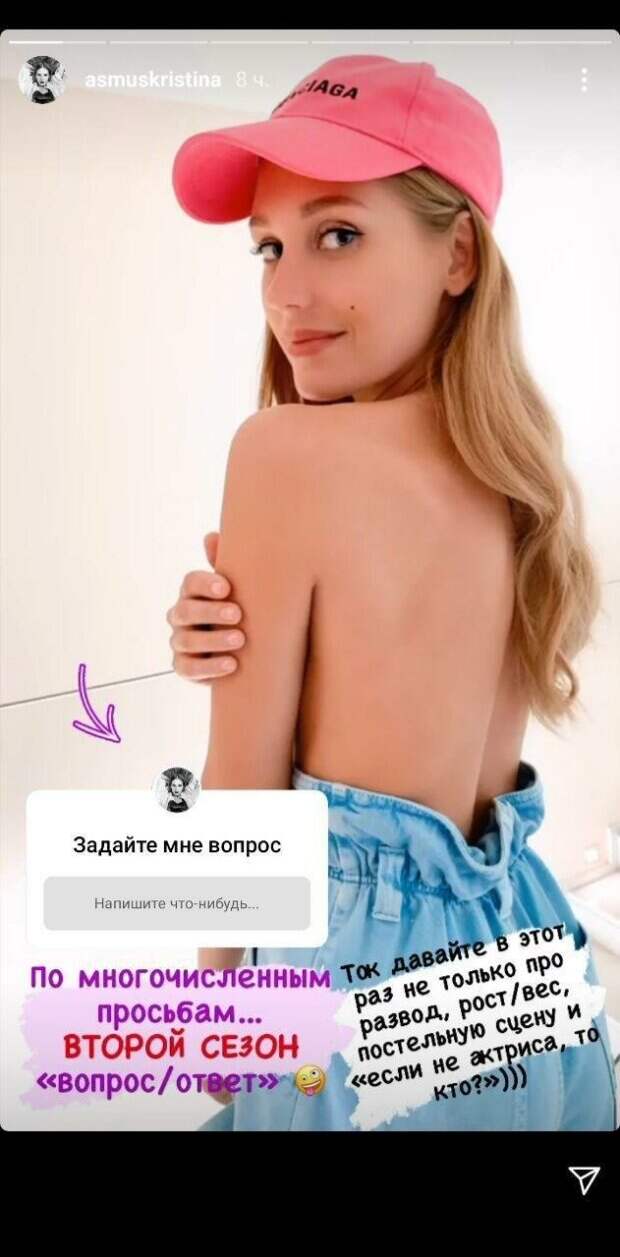 Скандальная российская актриса Кристина Асмус после развода с Гариком Харламовым делает все, чтобы подогреть интерес к своей персоне Об этом пишет Politeka.net со ссылкой на страницу артистки в Инстаграм. Так, Асмус предложила своим фолловерам задать любые вопросы, на которые обещала ответить. "По многочисленным просьбам, второй сезон вопрос/ответ", написала она.