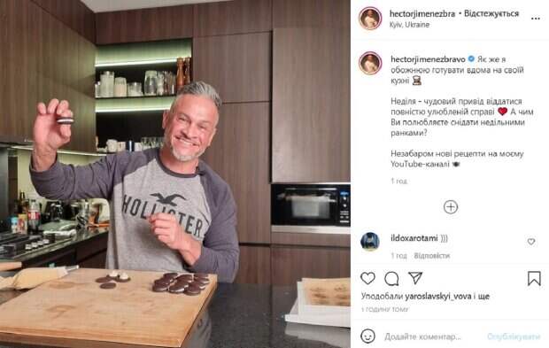 Эктор улыбается, и видно, как он сам счастлив от полученного результата. В посте к фото судья проекта "Мастер Шеф" рассказал, что занимается в воскресное утро любимым делом. "Как же я обожаю готовить дома на своей кухне