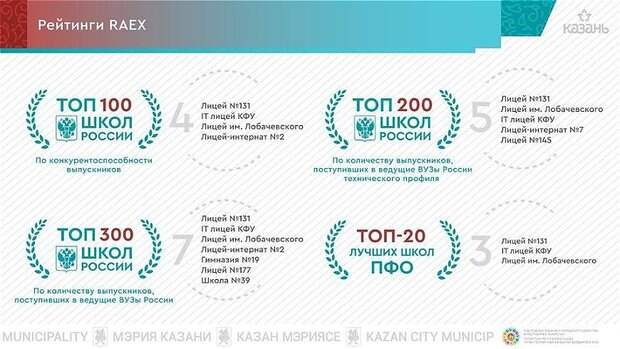 Казанские школы и лицеи вошли сразу в несколько рейтингов лучших учебных заведений по версии агентства RAEX.Так, в топ-100 российских школ по конкурентоспособности вошли лицей №131, IT-лицей и лицей им.Лобачевского КФУ, лицей-интернат №2. Они также попали в топ-300 школ по количеству выпускников, поступивших в лучшие вузы страны, рейтинг дополнили гимназия №19, лицей №177 и школа №39.