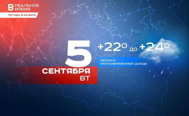 В Казани во вторник, 5 сентября, ожидается переменная облачность. Утром и днем кратковременный дождь, сообщили в Гидрометцентре по Татарстану. Днем в столице Татарстана воздух прогреется до +22..+24 градусов. Ветер юго-западный 3—8 м/с, утром и днем местами порывами до 12 метров в секунду. Такая же погода установится в целом по республике.