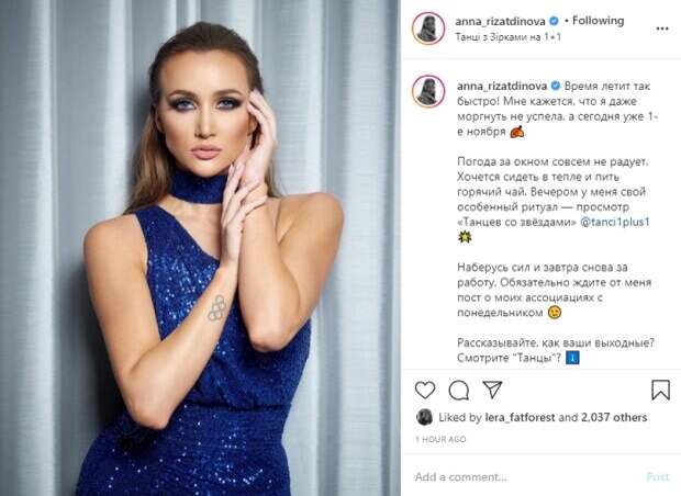 Анна Ризатдинова приняла волнительную позу: сложила руки и прикоснулась к виску с томным взглядом. "Время летит так быстро! Мне кажется, что я даже моргнуть не успела, а сегодня уже 1-е ноября