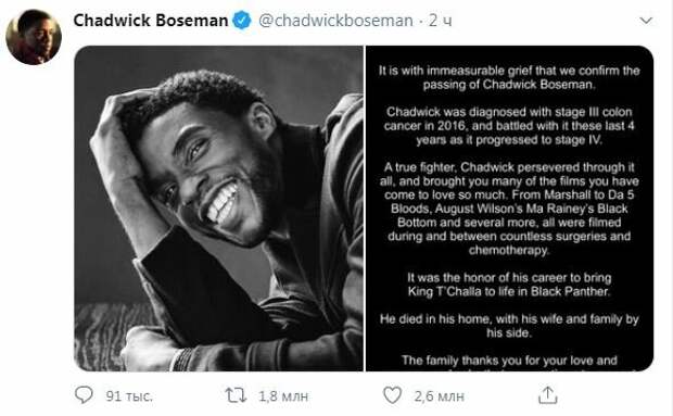 Известный актер Чедвик Боузман не смог побороть тяжелую болезнь Об этом информирует Associated Press. Так, артист, получивший популярность после роли Черной Пантеры, ушел из жизни в возрасте 42 лет. По информации журналистов, Чедвик Боузман скончался в Лос-Анджелесе в окружении жены и близких. Как известно, звезда "Черной Пантеры" последние четыре года пытался бороться с раком толстой кишки, но болезнь оказалась сильнее.