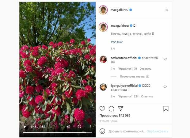 Шоумен гордится своим жильем и часто публикует кадры из него. В этот раз артист снял видео из своего сада. (Чтобы посмотреть, доскролльте до конца страницы) Галкин похвастался цветущими растениями, да так, что сама певица София Ротару не смогла устоять и написала: "Красота!!!