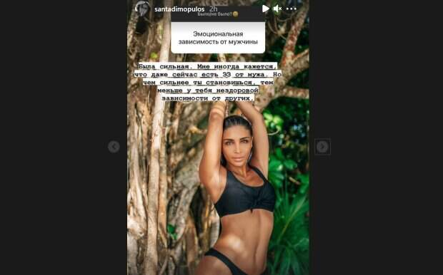 В таком курортном образе Санта Димопулос пощеголяла среди тропических деревьев и на периллах просторной террасы. В своих сториз экс-участница "ВИА Гры" заявила, что у нее была сильная эмоциональная зависимость от мужчины, даже сейчас она весьма привязана к своему мужу. Санта призналась и в своих физических недостатках: "Растяжки есть, просто не заметные. Даже если приблизите фото, то увидите их на ягодице". Артистка также рассказала о сильном желании прыгнуть с парашютом. "Моя мечта. Хочу здесь исполнить, хоть и муж запретил. Но я никогда не была послушной девочкой. Кто прыгал в Дубаи? Впечатления?", - поинтересовалась Димопулос у своих поклонников. Ранее певица призналась в одном из сториз, что неоднократно хотела уехать из Украины. "Если бы не семья, я бы жила в разных местах по несколько лет", - сообщила Санта. Напомним, победительница "Танців з зірками" Димопулос в бикини показала похудевшую на 15 килограмм фигуру А еще Politeka писала, что Димопулос из "Танців з зірками" в бикини изумила загаром, кадр, как из фильма Также Politeka сообщала, горячая Димопулос в бикини показала самые потаенные уголки своей виллы на Мальдивах: "Смотрите, какая..."