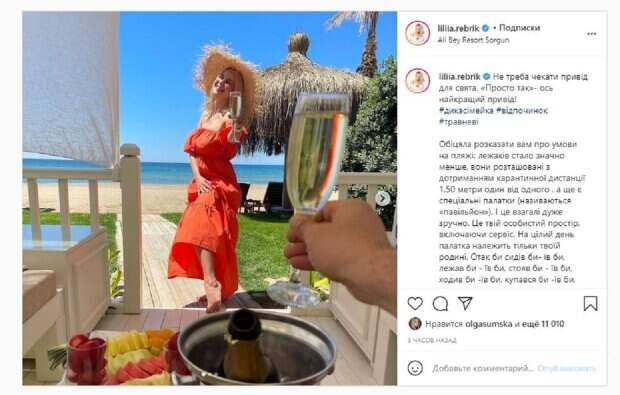 На фото Лилия позировала в красном платье и шляпке. Девушка стояла у берега моря, взявшись одной рукой за животик, а второй потянула бокал к мужу. На другом кадре пара уже сидела вместе, улыбаясь и держа шампанское. "Не надо ждать повод для праздника. «Просто так» - вот лучший повод! Обещала рассказать вам об условиях на пляже: лежаков стало значительно меньше, они расположены с соблюдением карантинной дистанции 1.50 метра друг от друга, а еще есть специальные палатки (называются «павильон»). И это вообще очень удобно. Это твое личное пространство, включая сервис", - написала красотка под фото. "Остановите меня", - добавила Лилия, рассказав о желании постоянно есть. Фанаты, включая Ольгу Сумскую, поставили более 11 тысяч лайков и написали комментарии: "Фотки вау", "Какие вы классные", "Самого лучшего отдыха", "Обожаю такие семьи", "Сказочные. Супер. Молодцы", "Лилия, как всегда невероятно волшебные". Сообщалось, что популярная украинская телеведущая Лилия Ребрик рассказала о новом увлечении. В этот раз Лилия показала, как они вместе с мужем Андреем Диким играют большой теннис ракетками. Пара в спортивной одежде и в кепках от солнца сфотографирована прямо на теннисном корте. Напомним, замужняя Лилия Ребрик в отпуске решила побегать на свидания Также Politeka писала, что Лилия Ребрик показала фигуру в купальнике, подразнив подарком из Турции А еще Politeka сообщала, что Лилия Ребрик на пляже впечатлила видом даже без купальника