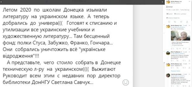 Как выяснилось, все этого проходит под руководством Светлана Савчук, которая в Донецке занимает должность старшего преподавателя кафедры документоведения и библиотековедения в Донецком национальном университете. Происходящее не осталось без внимания пользователей сети: "Похоже, цивилизация на Донбассе закончилась. Будет Кузбасс или Коми АССР", "Да. По школам сказали: чтоб Украиной тут и не пахло!", "А что тут удивительного? Они во все времена пытались уничтожить всё украинское. Гонялись и убивали наших кобзарей, писателей, в общем, всю интеллигенцию, все украинские газеты и прочие издания. Настоящие фашисты - это северные соседи", "Было ещё раньше. Большевики изымали книги, запрещали неугодных писателей. Лично Надежда Константиновна списки дозволенного составляла", - писали недовольные пользователи сети. Напомним, российская армия прибыла на помощь боевикам, тревожные данные с Донбасса. Как сообщала Politeka, артиллерист ВСУ объяснил, почему Донбасс было бы проще вернуть в 2014 году. Также Politeka писала, что ожесточенные бои развернулись на Донбассе, боевики ударили по защитникам Украины.