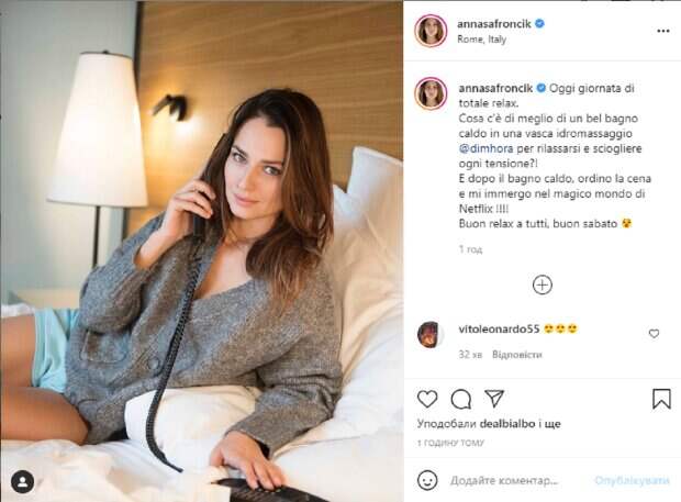 Так, недавно Анна опубликовала в микроблоге милое фото, на котором позволила фанатам заглянуть в свою спальню. Как видно, модель прилегла на мягкую кровать и схватилась за телефон, набирая номер доставки еды, по крайней мере, об этом она рассказывает в подписи к этому очаровательной снимку. Перед камерой Сафрончик появилась в скромном образе – на ней коротенькие светлые шортики и серый свитер. В подписи к публикации красотка написала: "Сегодня день полного расслабления. Что может быть лучше красивой теплой ванны в гидромассажной ванне, чтобы расслабиться и снять все напряжение?! А после горячей ванны заказываю ужин и погружаюсь в волшебный мир Netflix! Всем счастливого отдыха, счастливой субботы". Поклонники не остались равнодушны и принялись засыпать Анну комплиментами в комментариях. Напомним, Внучка Чапкиса из "Танців з зірками" в кружевном белье покрасовалась на камеру: "мечтать опасно" Как сообщала Politeka, 40-летняя внучка-красотка Чапкиса озвучила простой секрет, как сохранить молодость: "Найдите время для...". Также Politeka писала, Внучка Чапкиса из "Танців з зірками" без косметики и белья показала натуральную красоту: домашние кадры.