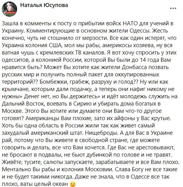 В сети многие украинцы были возмущены совместными учениями НАТО и украинской армии в Виннице На это обратила внимание волонтер Наталья Юсупова на своей странице в сети Facebook. Она рассказала, что под постом об учениях НАТО комментирующие, в основном, жители Одессы, заистерили о том, что Украина – "колония США", а все "украинцы рабы американцев".