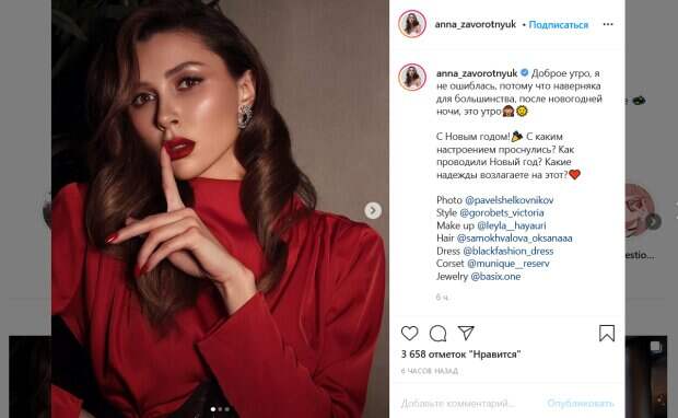 «Доброе утро, я не ошиблась, потому что наверняка для большинства, после новогодней ночи, это утро. С Новым годом! С каким настроением проснулись? Как проводили Новый год? Какие надежды возлагаете на этот?», - написала Анна. Пост она сопроводила своими фотографиями, на которых позирует в роскошном образе. На ней темно-красное платье с корсетом, благодаря которому девушка выглядит очень соблазнительно. Дополняет ее образ эффектный макияж с красной помадой и темными тенями. Поклонники красотки пришли в восторг от ее образа. Вспомнили в комментариях и о болезни ее матери. «С Новым Годом, Анечка. Как вы провели новогоднюю ночь, Нют? Счастья вам и близким. Самая красивая», «Ань, твоя мамочка обязательно выздоровеет, ведь она очень сильная, пусть она никогда не болеет и будет самой счастливой, ведь если наши мамы счастливы, то и счастливы мы. Анют, ты тоже будь сильной, не сдавайся, не грусти и не плачь, старайся улыбаться, это придаст твоей мамочке еще больше сил», «Шикарная надеюсь, что этот год будет лучше», - пишут люди. Напомним, дочь онкобольной Заворотнюк с новой прической пожаловалась на внешность. Как сообщала Politeka, дочь онкобольной Заворотнюк нараспашку прогулялась по улицам города: вылитая Анастасия. Также Politeka писала, что дочь онкобольной Заворотнюк в корсете показала, как не нужно встречать Новый год.