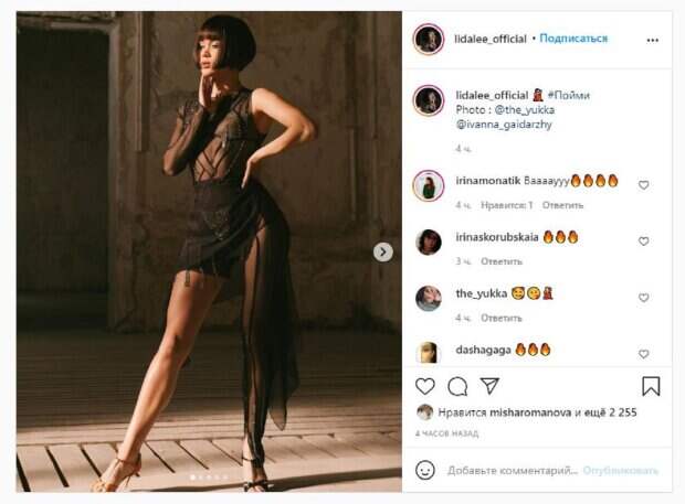 Известная украинская певица Лида Ли, подопечная Дмитрия Монатика, показала себя в обворожительном образе На фото Лида показалась в прозрачном наряде с узорами. Девушка стояла в босоножках, выставив одну ножку и выгнувшись, хвастаясь безупречной фигурой. На других кадрах уже певица была с мужчиной в кожаных штанах.