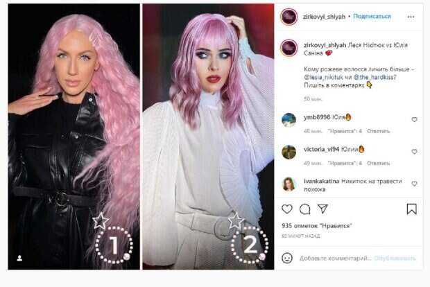 И вот, на страничке "Зірковий шлях" решили сравнить звездных артистов, предложив украинцам выбрать лучшую. На фото Санина была в блузке и брюках с поясом. А Леся Никитюк была в рубашке и юбке в разрезом. Певица и телеведущая дополнили образами розовыми волосами. "Леся Никитюк против Юлии Саниной. Кому розовые волосы идут больше?", - был задан вопрос под фото. Фанаты сразу начали обсуждать фото: "Юля", "Конечно Юли", "Вау, я прям растерялась. Обе шикарные", "Санина+Никитюк обоев хороши по своему", "Идет больше Юле, но Лесю больше люблю". Напомним, танцор Поляковой после провала на "Холостячке" с Огневич нашел ей "замену" А еще Politeka писала, что о Лесе Никитюк сняли фильм, появилось полное видео и реакция ведущей Также Politeka сообщала, что Никитюк в кожаном костюме и с розовым волосами резко обратилась к фотографу