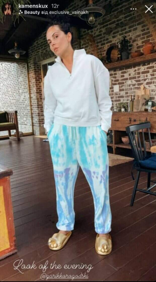Не обошлось без привычных шутливых Стори в Инстаграм на их страницах. Причем в этот раз Настя позировала не в удобной крошечной одежде, показывая фигуру. На новых кадрах Каменских предстала в светлой толстовке без ярких принтов и в цветастых штанах. Позируя в надменной позе в стиле мужа, Настя хотела продемонстрировать главную «достопримечательность» своего образа – золотые тапки с пикантными деталями. Изображение мужских гениталий на тапочках подруги насмешило и саму Андрийчук, которая выложила у себя на странице, как Каменских размахивает ногами, пока болтает с ней на отдыхе. Напомним, Каменских в полосатом бикини показала, что вытворяет дома без Потапа: "Такого еще не было...". Как сообщала Politeka, Раздетая Каменских разлеглась на кровати, в Сети заподозрили неладное: «Вы родили ребенка...». Также Politeka писала, Каменских понежилась под солнцем, сверкнув ножками в мини: "Часик полного chill out".