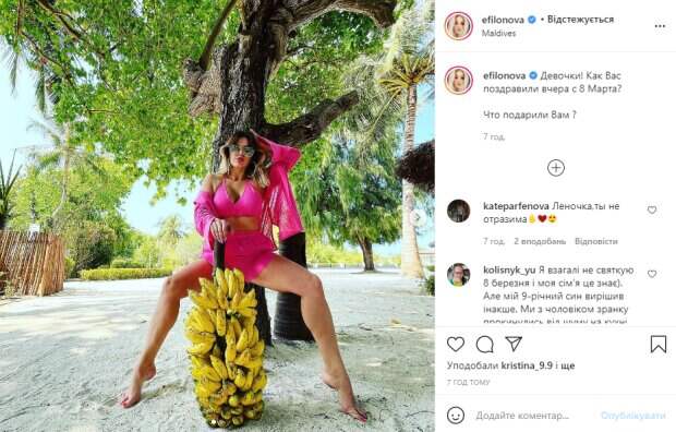 Лена активная блогерша в соцсети Instagram, где часто делится с поклонниками своими приключениями. Девушка прослыла в соцсетях, как любительница вкусно покушать, оттого у нее такая аппетитная фигурка, которая многим очень нравится. Недавно красотка отправилась на отдых на Мальдивы, откуда уже выложила несколько пикантных кадров. Как видно, на новых фото Филонова запечатлена на красивом экзотическом пляже среди густой зелени. Перед камерой она появилась в соблазнительном и ярком образе – на ней малиновые шортики и короткий топ, поверх которого она накинула прозрачную розовую рубашку. Волосы красотки распущены и небрежно уложены, а на ее лице стильные солнцезащитные очки. Лена, играя, вертится возле огромной ветки со спелыми бананами. В подписи к фотографиям телеведущая написала: "Девочки! Как Вас поздравили вчера с 8 Марта? Что подарили Вам?". Конечно же такая публикация не осталась без внимания поклонников Филоновой, пользователи принялись засыпать ее комплиментами и отвечать на вопросы. Напомним, "Клоуны закончились?": телеведущая Филонова идет в мэры Киева, украинцы не подбирают слов. Как сообщала Politeka, Елена Филонова из "Ревизора" показала свои пышные дары природы в прозрачном корсете: "Баба огонь! ". Также Politeka писала, Звезда «Ревизора» Лена Филонова попотела на камеру ради идеального тела: "Мощно, очень!".