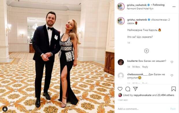 Пикантными фишками наряда стал длинный разрез подола, обнаживший ножку звезды, и волнительное декольте. Ведущий "Холостячки" нарядился в элегантный смокинг с галстуком-бабочкой. Григорий Решентник встретился с исполнительницей в холле отеля, Тина Кароль прижалась к знаменитому красавцу и с радостной улыбкой положила руку ему на плечо. Телеведущий в свою очередь чуть наклонился к ней, поправляя манжет рубашки. "Холостячка 2 сезон