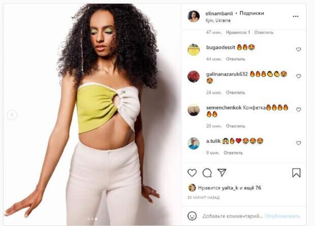 Звезда поставила цель в жизни - очень много путешествовать. А сейчас певица занята любимой работой и активно ведет страничку в Инстаграм, где показывает много интересного. На новом фото Элина показалась в узких белых штанах и необычном топе с довольно интересным вырезом. Мбани опубликовала несколько фотографий. "Любимый образ из новой коллекции", - написала Мбани. Фолловеры поставили более 70 лайков и написали комплименты экзотической красавице: "Вау, кто нибудь тушите этот огонь", "Конфетка", "Огонь", "Очень красивая". Напомним, экзотическая девушка из «Женского квартала» удивила, на что идет ради съемочного процесса Также Politeka сообщала, что экзотическая девушка из «Женского квартала» в атласном платье приковала взгляды к глубокому вырезу А еще Politeka писала, что экзотическая девушка из "Женского квартала" в мини-топе позволила разглядеть свою красоту
