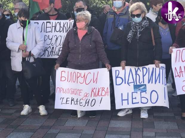 Возле здания Верховной рады в украинской столице проходит акция протеста за возобновление авиасообщения с Республикой Беларусь. Об этом информирует журнал «Фокус». По данным журналиста украинского издательства, в акции участвуют около 100 человек, участники держат плакаты «Верните рейс Киев — Минск», «Откройте небо», портреты президента Украины Владимира Зеленского и Александра Лукашенко и государственные флаги Украины и Беларуси.