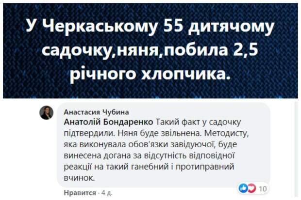 В Черкассах вспыхнул скандал в детском саду Двухлетний малыш получил синяки в результате избиения. Руку на него подняла няня в детском саду. Вопиющий инцидент произошел в Черкассах. Об этом сообщила Татьяна Панасенко в сообществе "Новости Черкащины" в Facebook. Местные власти отреагировали на инцидент и сообщили, что в детском саду подтвердили информацию об инциденте.