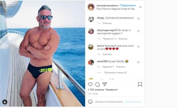 На опубликованном фото Хименес-Браво предстал в одних лишь плавках, оперевшись на поручень яхты. Такую смелость 49-летней знаменитости оценили не все его поклонники: "Лучше бы плавки были шортиками", "Подписываешься. Ожидание: рецепты. Факт: постоянно обнаженный Эктор", "Вы повар или престарелый нуддист?", "Дедуля на отдыхе", - писали в комментариях под постом. Ранее мы сообщали, что судья "Мастер шеф" опубликовал фото, на котором предстал с ватными палочками в носу, чем вызвал негодование своих поклонников. Некоторые из них объяснили, что это некая процедура красоты, но публиковать такое откровенное фото посчитали лишним. Напомним, что мускулистый судья "Мастер Шеф" Хименес-Браво прижал к себе Никитюк: "Для идеального вечера важна…" Как сообщала Politeka, загорелый судья "Мастер Шеф" Хименес-Браво без одежды заставил дам изнывать от желаний: "Хватит уже…" Также Politeka писала, что "Мастер Шеф" Хименес-Браво с любимой на руках показал идеальный день в домашней обстановке: "Красивая парочка"