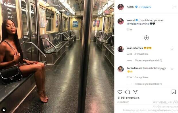 Легендарная супермодель Наоми Кэмпбелл решила сверкнуть невероятными изгибами и спустилась в подземку без одежды и белья Об этом сообщает Politeka со ссылкой на Instagram знаменитости. «Неопубликованные фото», - коротко говорится в сообщении. Уточним, что на снимках Кэмпбелл позирует абсолютно без белья, прикрывая пикантные места ногами, волосами и даже цепочкой от сумочки.