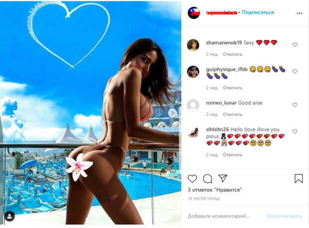 На отдыхе Алена привыкла показывать мини-бикини самых разных дизайнов, ведь она рекламирует одежду каждый день. На одном из фан аккаунтов появился жаркий кадр из раннего отдыха модели. Девушка предстала в ярко-оранжевом бикини и покрутила ягодицами прямо перед объективом. Кадр не оставил фанатов равнодушными: «Огоооо