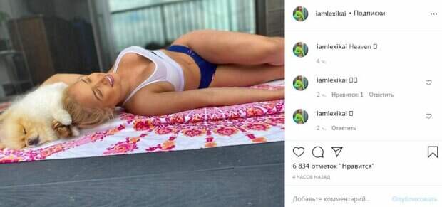 Красотка надела белый топик с прозрачной сеточкой по декольте. Большой бюст едва ли не выпрыгивал из большого выреза, тем более поза была довольно пикантной. Модель надела крохотные синие шортики, натянув их чуть выше бедер. Тонкая талия, идеальный пресс, накаченные ножки - в этом теле идеально все. Звезда лежала, широко улыбаясь. Она прижалась головой к пушистой собачке. В одном из кадров песик посмотрел в камеру. "Небеса