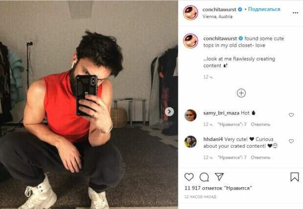 Популярный певец Том Нойвирт, которого все знают под творческим псевдонимом Кончита Вурст, вновь порадовал своих фанатов Новые снимки звезда опубликовал в своем Instagram. Победитель Евровидения решил устроить небольшую фотосессию напротив зеркала, примеряя различные наряды. Сперва Том Нойвирт немного присел и появился в красной футболке и спортивных штаха.