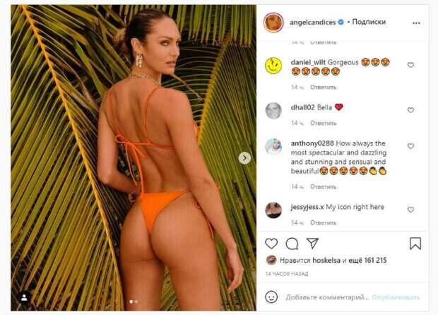 Известная модель и звезда "Victoria’s Secret" Кэндис Свейнпол показала себя на отдыхе На фото Кэндис позировала в оранжевом бикини, развернувшись спиной. Звезда показалась на фоне экзотических деревьев, а волосы решила собрать в хвост. На втором кадре Свейнпол уже сделала акцент на ягодицах, которые были в песке.