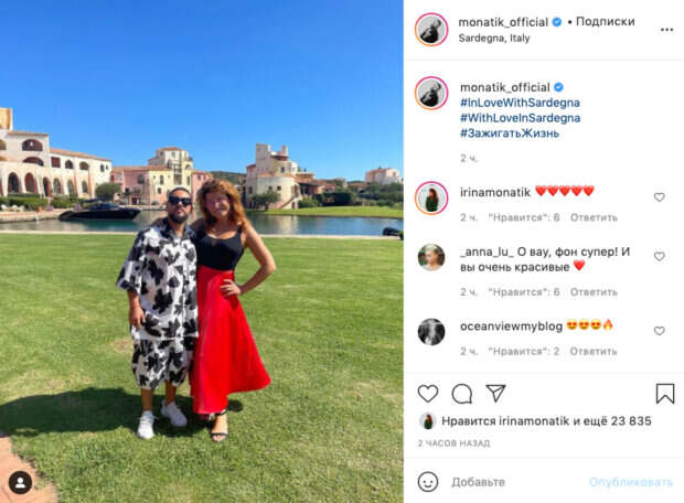 На этот раз артист опубликовал новое фото на своей странице в Инстаграм. На снимке - Дмитрий в белом костюме с черными узорами из рубашки и шорт, обнимает свою жену Ирину. Избранница Монатика позирует на камеру в шикарном виде. На ней черный топ, который подчеркивает её формы и длинная красная юбка. Фанаты засыпали семейную пару приятными словами в комментариях: "Костюм бомба", "Шикарные", "Красивые такие", "Самые лучшие", "Какие классные", "Хорошенькие", "Дмитрий, надо ещё что-то про жену новое спеть Вам, это ж королева", "Очень приятная женщина. Аппетитная. Не суповой набор". Ранее сообщалось, Потап заговорил о красивом завершении своей карьеры и подколол Монатика: "Тыняется, заслуженого дали" Также, Монатик покинул Украину и устроил жене идеальное свидание, о таком мечтает каждая: "Какие вы зажигательные" Politeka рассказывала, жена Монатика выбралась на романтичную прогулку с мужем по Милану, и сделала признание: "Именно с тобой..."