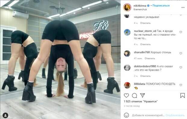 Актриса Екатерина Никитина, звезда "Квартал 95", изумила смелым ракурсом Как передает Politeka.net, 24-летняя знаменитость опубликовала свежее фото в своем микроблоге в Инстаграм, на котором застыла в "неудобной" позе. Так, Никитина, увлекающаяся пол дэнсом (то есь танцами на шесте), решила позабавить публику акробатическим трюком.