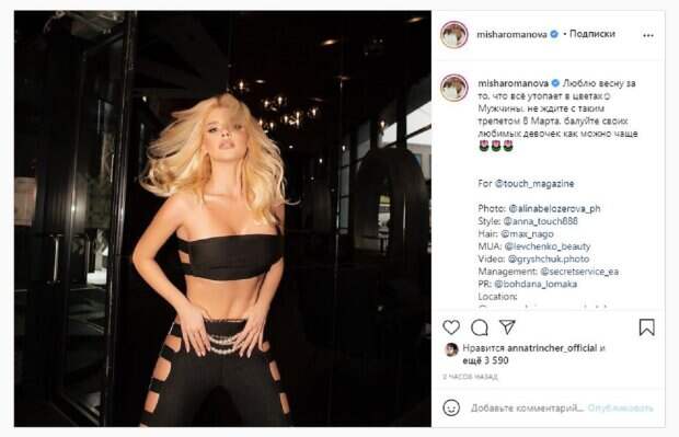 Известная певица Миша Романова, бывшая солистка группы ВИА Гра и подруга Макса Барских, показала себя в весеннем образе На фото Миша показалась в черном топе и штанах. Наряд у красотки был с вырезами, но привлекал внимание тугой топ, который разрывался от пышного бюста девушки. Романова запустила пальчики рук в штаны, делая кадр максимально горячим.