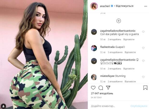 Чери заявила, что эти лосины заставляют ее чувствовать себя плохой девчонкой с отличной «пятой точкой». За час пост красотки собрал более 30 тысяч лайков. В комментариях ей оставили массу приятных слов. «Надеюсь выглядеть так же хорошо, как вы скоро», «Давай оооочень!», «Фантастика!», «Ты такая красивая», «Ты как солнечный свет. Ты заставляешь меня чувствовать себя счастливым», «Прекрасная дама», «Удивительная», - пишут пользователи сети. Ранее мы писали, что Ана Чери активно занимается спортом, показывая результаты своих тренировок. Несмотря на это, ее фигура выглядит женственной. На одном из последних сториз Чери без лишней скромности похвасталась большой грудью в бикини. Она натянула на упругие прелести необычный купальник, который прикрыл лишь часть ее груди. Часть прелестей выглядывало из-под купальника, что придало особой пикантности снимку. Напомним, что фитнес-модель Ана Чери в узком купальнике искупала свои самые вкусные места в бассейне: "Лапочка". Как сообщала Politeka, Ана Чери заставила любоваться совершенным телом в приспущенных шортиках: "Жаркая леди". Также Politeka писала, что кокетливая Чери в леопардовом корсете заставила покраснеть, показав прелести: «Вау, какая львица».