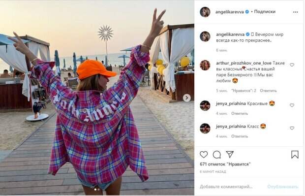 Девушка повернулась к камере спиной, чтобы все могли оценить ее стройные обнаженные ноги. Обе руки звезда подняла вверх, сделав из пальцев два символа "V", означающих победу. На втором фото Анжелика уже рядом с мужем, которы одет совсем по-летнему. На нем – черные обтягивающие шорты, черная майка, белые кепка и шлепки. Где сделаны фото - неизвестно, но судя по небоскребам, виднеющимся вдали, это может быть Дубаи. "