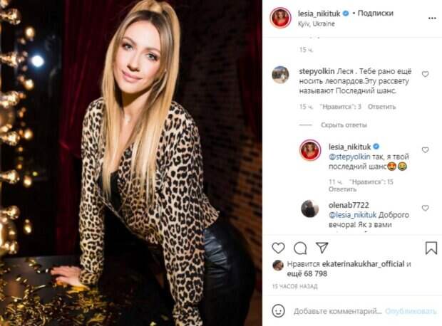 Звезда сделала высокий хвостик, уложив локоны на плечи, и нанесля яркий макияж в розовых тонах. Девушка подписала сочный кадр одним словом, но зато каким красноречивым: "Мяу". Пользователи расценили это так, будто Никитюк вышла на "мартовскую охоту" - дерзкий образ тому только подтверждение. Один из фанатов девушки отметил, что телеведущей, мол, рано еще прибегать к таким крайностям. "Леся, тебе рано ещё носить леопардов. Эту расцветку называют последний шанс", - прокомментировал пользователь. На что Никитюк сделала неожиданное предложение: "Так, я твой последний шанс