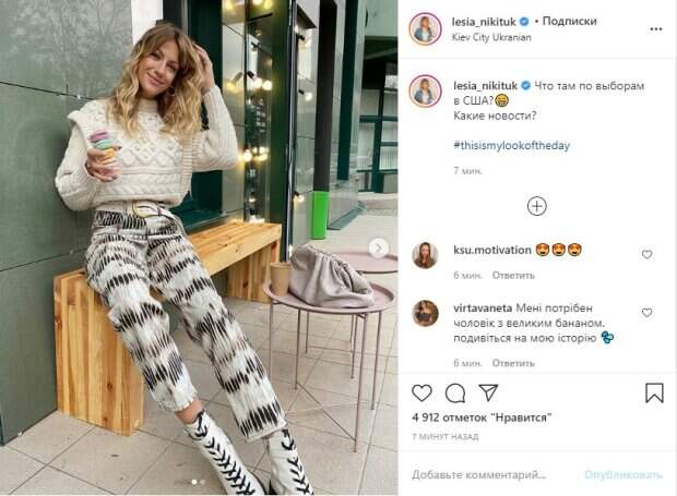 net. На снимках Леся одета в обтягивающие брюки с широким ремнем, стильный свитерок под горло, на ногах у ведущей – белые ботинки с высокой шнуровкой. "Что там по выборам в США?