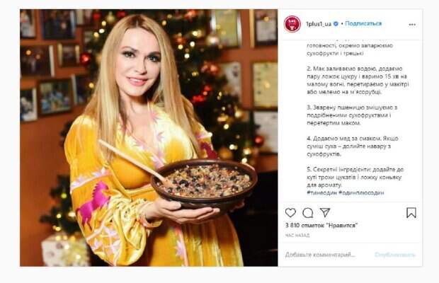 "Друзья, вкусной кутьи и громкой коляды вам! Делитесь в комментариях, какие блюда вы сегодня будете подавать на стол и попробуйте приготовить кутью с секретным ингредиентом по фирменному рецепту Ольги Сумской. 1. Варим пшеницу (можно заменить булгуром, рисом) до готовности, отдельно запариваем сухофрукты и грецкие орехи. 2. Мак заливаем водой, добавляем пару ложек сахара и варим 15 мин на малом огне, перетираем в ступке или мелем на мясорубке. 3. Сваренный пшеницу смешиваем с измельченными сухофруктами и перетертым маком. 4. Добавляем мед по вкусу. Если смесь сухая - долейте навара из сухофруктов. 5. Секретные ингредиенты: добавьте к кутье немного цукатов и ложку коньяка для аромата", - написано в публикации. Фанаты поставили более 3 тысяч лайков и написали комментарии: "Спасибо и вам вкусной кутьи", "С наступающим вас Рождеством Христовым", "Вам вкусной кутьи. Веселых праздников", "А мы в прошлом году кутью делали с рисом, хотя раньше с пшеницей. Очень вкусно выходит. Счастливого Рождества". Сообщалось, что знаменитая украинская актриса Ольга Сумская показала, как развлекается на отдыхе с мужем и дочерью. После нового года знаменитость решила отдохнуть от городской суеты, и отправилась покататься на лыжах в Карпаты. Компанию ей составили муж – актер Виталий Борисюк и их 18-летняя дочь Анна. Напомним, 54-летняя Сумская показала семейные развлечения, удивив внешностью дочери А еще Politeka сообщала, что 54-летняя Ольга Сумская впечатлила внешностью на отдыхе в Карпатах Также Politeka писала, что растрепанная дочка Ольги Сумской с бокалом сверкнула внушительным декольте