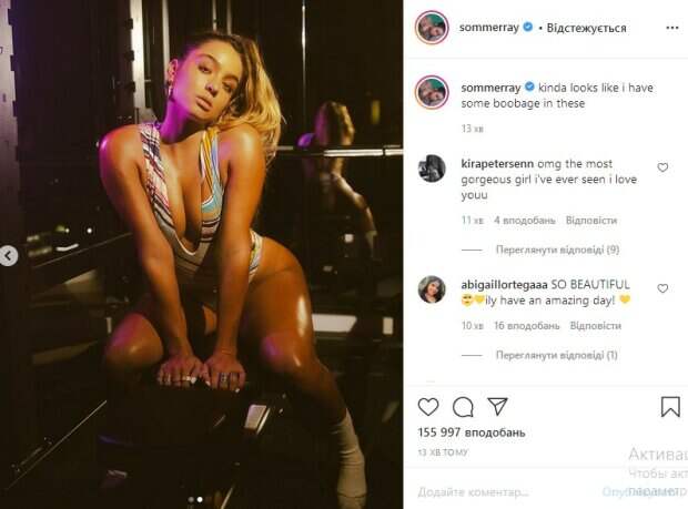 Знаменитость умостилась на лавку для жима, элегантно расставив при этом ноги и томно поглядывая в кадр. «Вау, какая упругая мотивация», «ты сделала меня сегодня счастливым», «само совершенство. Ты долго работала над телом, это видно», «Рэй, ты просто безупречное тело имеешь. Загляденье», «очень мило выглядишь», - пишут ее поклонники. До этого мы рассказывали, что американская фитнес-модель Соммер Рэй показала яркое фото в цветном бикини на отдыхе. Молодая спортсменка славится своей любовью к ярким и необычным купальникам. Так как фитнес-модель не только занимается спортом и рассказывает о своих тренировках, но еще и занимается магазином, она постоянно примеряет новые образы. Чаще всего Соммер либо надевает дизайнерские бикини, либо новые костюмы, которые сама же и создала. Напомним, фитнес-модель Соммер Рэй выпустила на свободу "крошек" в леопардовом белье А еще Politeka писала, что фитнес-модель Соммер Рей показала загорелое тело, извалявшись в песке Также Politeka сообщала, что фитнес-модель Соммер Рэй ослепила своими прелестями в "кислотном" бикини