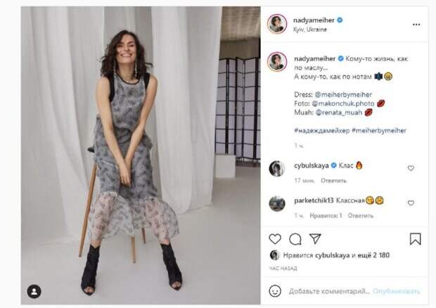 Сейчас красотка активно ведет социальные сети, делясь там своим творчеством. В этот раз красотка показалась в полупрозрачном платье, сидя на барном стуле. Красотка улыбалась, закрыв глаза от удовольствия, а волосы оставила распущенными. "Кому-то жизнь, как по маслу... А кому-то, как по нотам", - написала девушка. "Класс", - ответила коллега по цеху Ольга Цибульская. Фанаты сразу начали активно лайкать и комментировать публикацию: "Классная", "Божественная", "Музыкалочка ты наша", "Хорошая фотография", "Платье прелесть. Где можно такое взять?", "Надюш, ну почему ты такая красивая и не стареешь совсем?". Сообщалось, что бывшая солистка группы ВИА Гра рассказала о переменах в жизни. "Уже осенью новый кинопроект. Комедия. Моя героиня, деловая женщина, которая давно потеряв какое-либо ощущение романтики, поглощенная зарабатыванием денег, начала терять все нажитое «непосильным трудом», и в первую очередь семью...", - написала Мейхер. Напомним, экс-ВИА Гра Мейхер расстегнула блузу, впечатлив чувственным образом Также Politeka писала, что экс-ВИА Гра Надя Мейхер в воздушном платье с декольте показала соблазнительный образ А еще Politeka сообщала, что Надя Мейхер подчеркнула свои знаменитые формы полупрозрачным нарядом