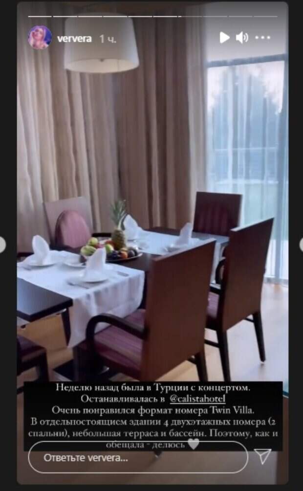 net. "Неделю назад была в Турции с концертом. Очень понравился формат номера Twin Villa. В отдельно стоящем здании 4 двухэтажных номера (2 спальни), небольшая терраса и бассейн. Поэтому, как и обещала - делюсь