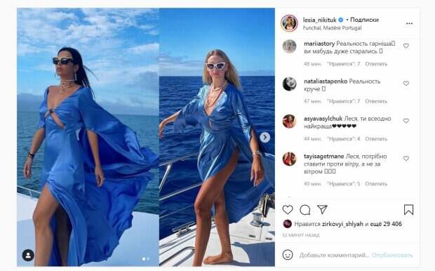 Ко всему прочему, телеведущая активно ведет Инстаграм, на который подписались уже 3,7 миллиона пользователей сети. В новом посте звезда похвасталась отдыхом на роскошной яхте. Леся позировала в синем шелковом платье с вырезами наверху и длинным разрезом на юбке. Ветер приподнял юбочку телеведущей, засветив бедро. Никитюк сделала два фото, рассказав о своей неудачи, ведь ветер прижал платье к спине, в результате не вышло эффектного кадра. "Ожидание-реальность